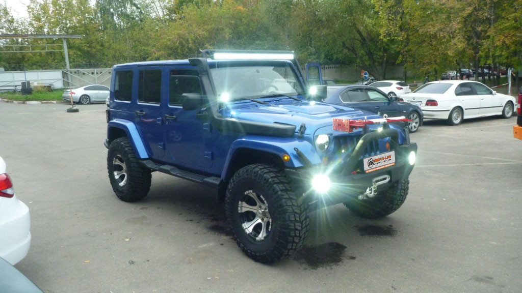 - Дополнительно к противотуманным фарам на автомобиль установлены светодиодные фары дальнего света под лобовым стеклом и светодиодная балка комбинированного света на крыше